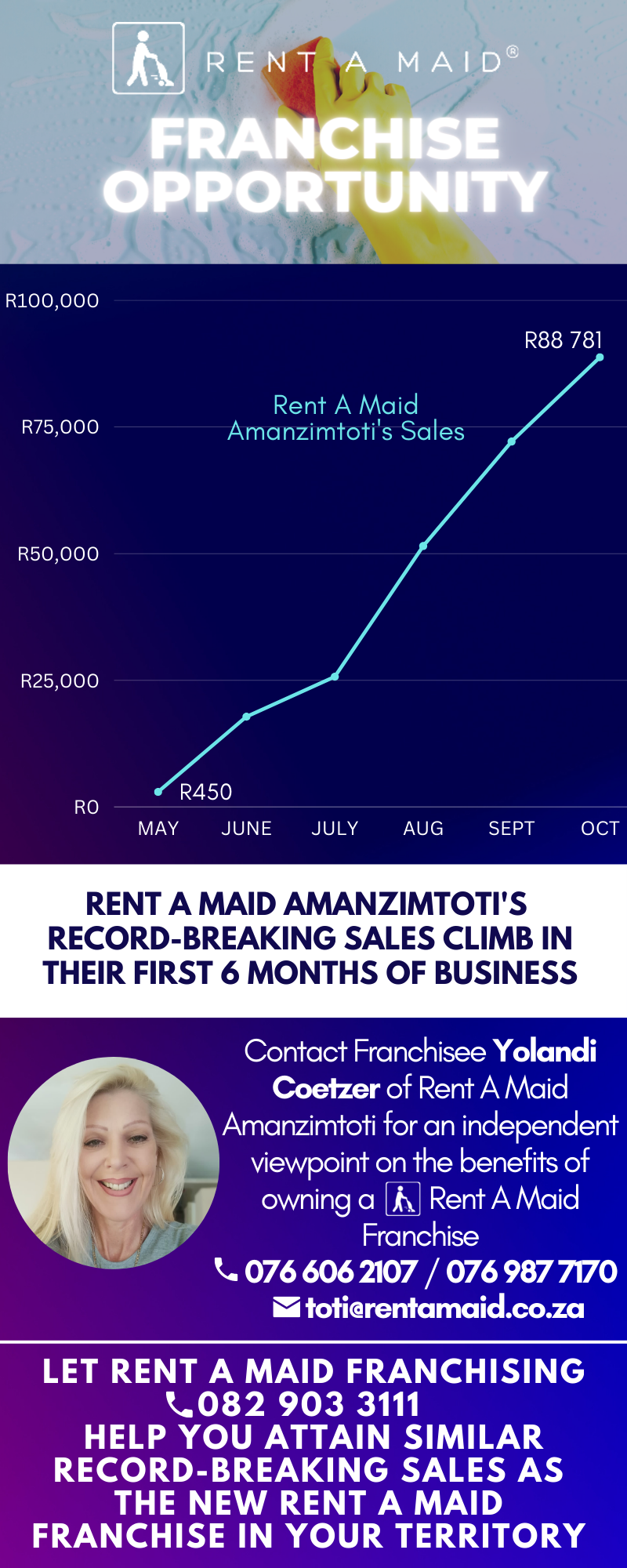 Rent A Maid SA was founded in the 1980’s as a response to the ever-increasing need for outsourced cleaning services in South Africa. We are an industry leading home and business cleaning company with 25 successful branches and franchises nationwide. We currently employ around 500 staff members, and our head office is situated in Hillcrest, KwaZulu-Natal.